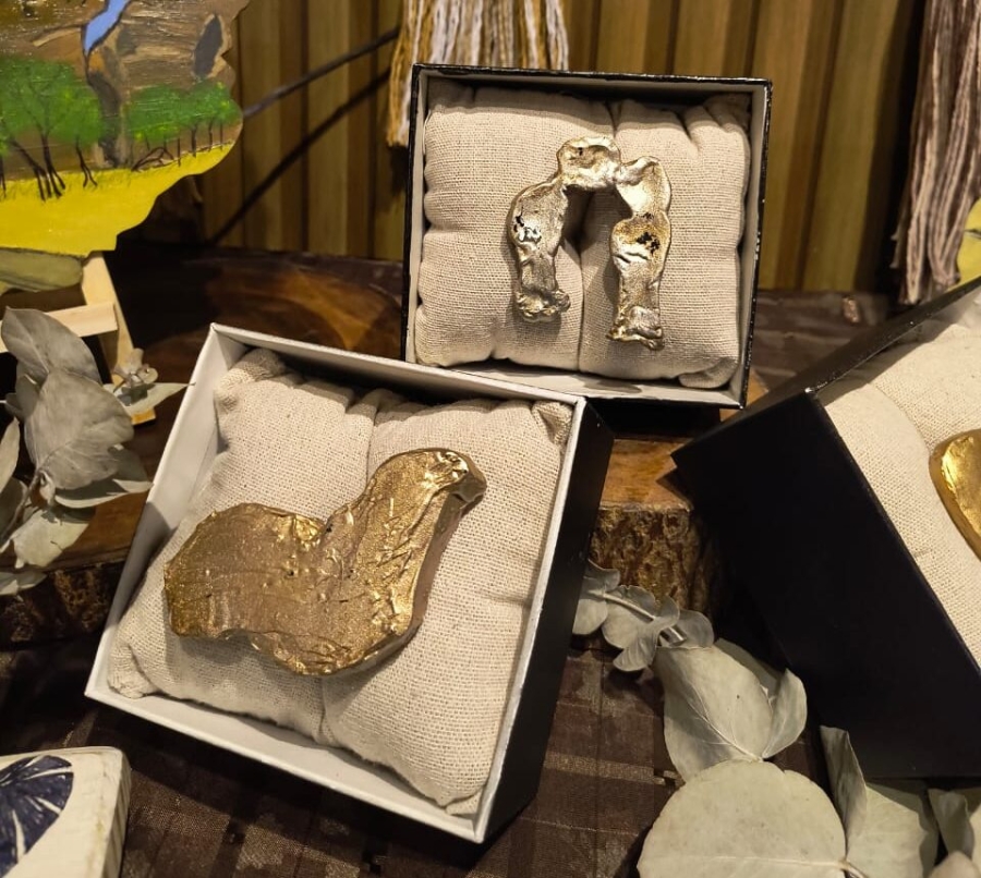 Inspiradas pela tradição da modelagem em cerâmica, as irmãs desenvolveram uma técnica própria que une papelão e massa corrida. “Evidenciamos a transformação do papelão e massa corrida em arte com textura e sentimento. Cada relevo nasce do toque das mãos, do cuidado e da vontade de reinventar o simples. Inspirada na tradição piauiense da modelagem em cerâmica, essa técnica celebra o fazer manual e o vínculo com nossas raízes. As peças ganham cor, leveza e resistência, mantendo viva a essência do feito à mão e do feito com o coração”, explicam.