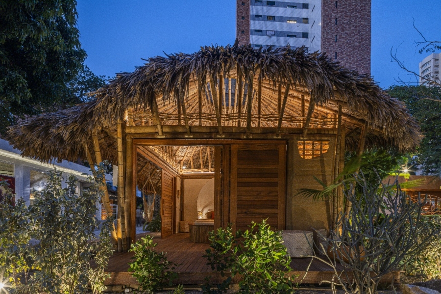 Já o Bangalô Duna, projeto de Julia Gasparini com a expertise da Bambugalô (empresa cearense especializada em construção com o material), assume o bambu em estrutura orgânica, acompanhando curvas e contornos como quem lê a geografia das areias. Aqui, a arquitetura literalmente “respira” com o espaço. Gasparini, que já explorava o tema em pesquisas e obras anteriores, descreve o bambu como “sistema construtivo inovador, sustentável” e lembra que materiais naturais são “essenciais para a conexão do corpo humano com a natureza”. No bangalô, essa ideia ganha matéria: menos peso, mais permeabilidade; menos excesso, mais aconchego.