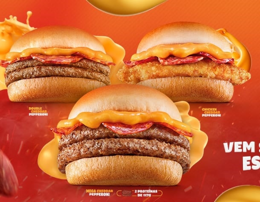 Já o Double Cheddar Pepperoni completa o portfólio com dois hambúrgueres, três fatias de pepperoni e o molho cheddar em uma versão equilibrada, pensada para quem busca sabor marcante em uma medida mais clássica.