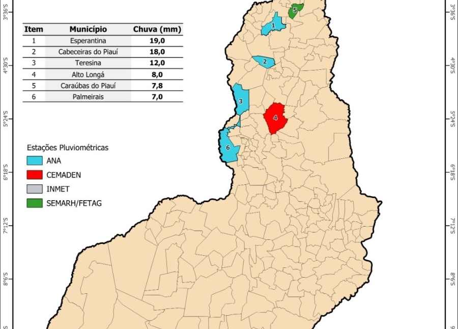 A convergência entre essa umidade e as altas temperaturas contribuiu para a ocorrência das chuvas, principalmente nas regiões Centro-Norte e Norte do estado. Entre as cidades que registraram os maiores volumes estão Esperantina, 19 mm; Cabeceiras do Piauí, 18 mm; Teresina, 12 mm e Alto Longá, com 7 mm.
